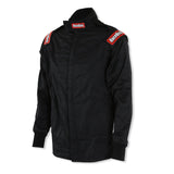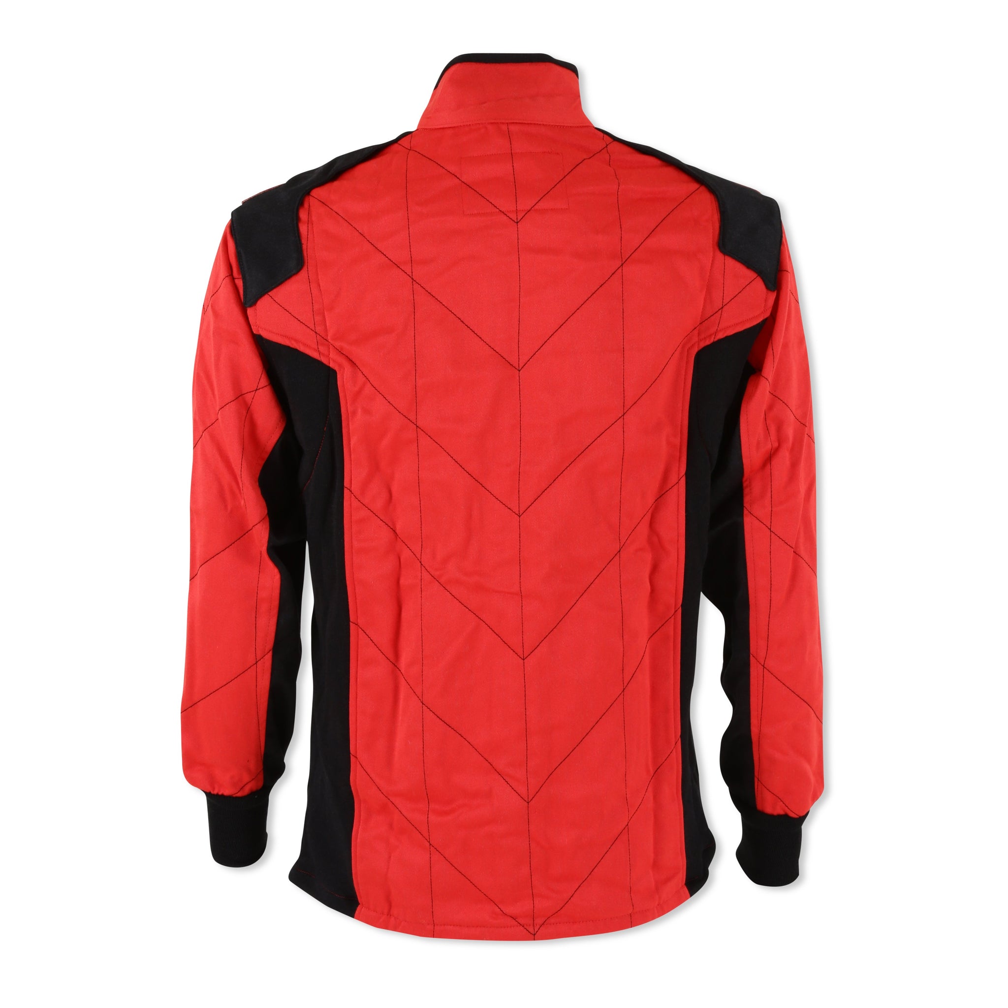 The RaceQuip 9161 series Chevron-5 multi-layer SFI-5 racecar driver's fire suit jacket is comprised of an outer layer made from durable Nomex® and a soft, comfortable, and lightweight Nomex® liner with a Chevron pattern box quilting. The stylish, modern Euro design is accentuated with black trim, Euro epaulets, black side panels, and black Nomex cuffs. The side panels feature knit stretch fabric for flexibility in the torso, and the 180° floating arm gussets increase flexibility in the arms. The Chevron-5 jackets feature a high-quality, heavy-duty Nomex®-backed brass two-way zipper installed with a double overlap for a more secure front opening. It exceeds SFI 3.2A/5 specifications and is available in Black, Red, or Blue with Black accents. The jackets are manufactured in sizes Small through 3X-Large. Note that sometimes these materials are referred to as "fireproof," but in reality, all auto racing safety gear is "fire-retardant."