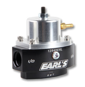 Earl's® Billet Fuel Pressure Regulators are part of a complete line of fuel system products from Holley®. They are precision machined from 6061-T6 billet aluminum for strength and durability. They feature a black bright dip anodized body and a clear bright dip anodized top for corrosion resistance and good looks. The Earl's 12846ERL fuel pressure regulator features (1) -8 AN O-ring inlet, (1) -8 AN O-ring outlet, and (1) -6 AN O-ring return.